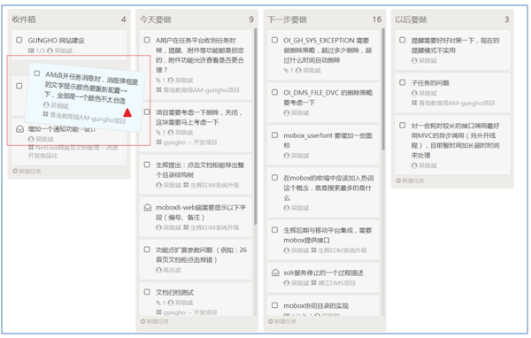 任務看板里出現的任務均是操作者需要處理的任務,看板的目的在給這些要處理的任務簡單做一個計劃,比如A任務今天做,B任務下一步做,C任務以后做,不需要你明確到具體日期只是做一個大概的規劃。因此在任務看板中我們看到的是4個泳道。