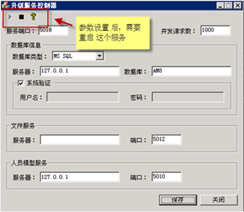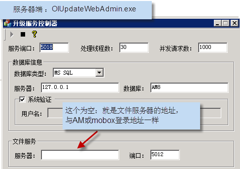 注解: 文件服務(wù)的服務(wù)器地址 (要求在局域網(wǎng)及外網(wǎng)都能訪問(wèn)的IP地址)若有些用戶沒(méi)有外網(wǎng),則就是內(nèi)網(wǎng)能訪問(wèn)的地址。 (一般我們的升級(jí)服務(wù)與AM8/Mobox的主服務(wù)都是在一臺(tái)機(jī)器上)參數(shù)更新后,需要重啟這個(gè)服務(wù)