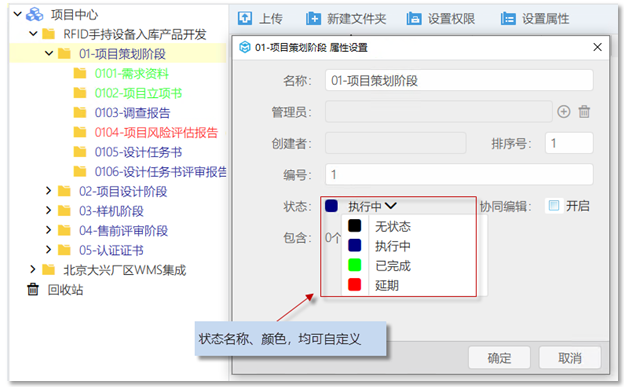 項目在實施的時候,各個階段或任務(wù)其對要求上交的文檔是有要求的。這個判斷可以有管理員來分析確定。當(dāng)某一個階段的文件已經(jīng)提交完整,我們可以對這個文件夾設(shè)置一個“已完成”的狀態(tài)標(biāo)識,并對文件夾顏色進行區(qū)分,這樣其他人員能一目了然的知道目前項目文檔歸檔的狀態(tài)